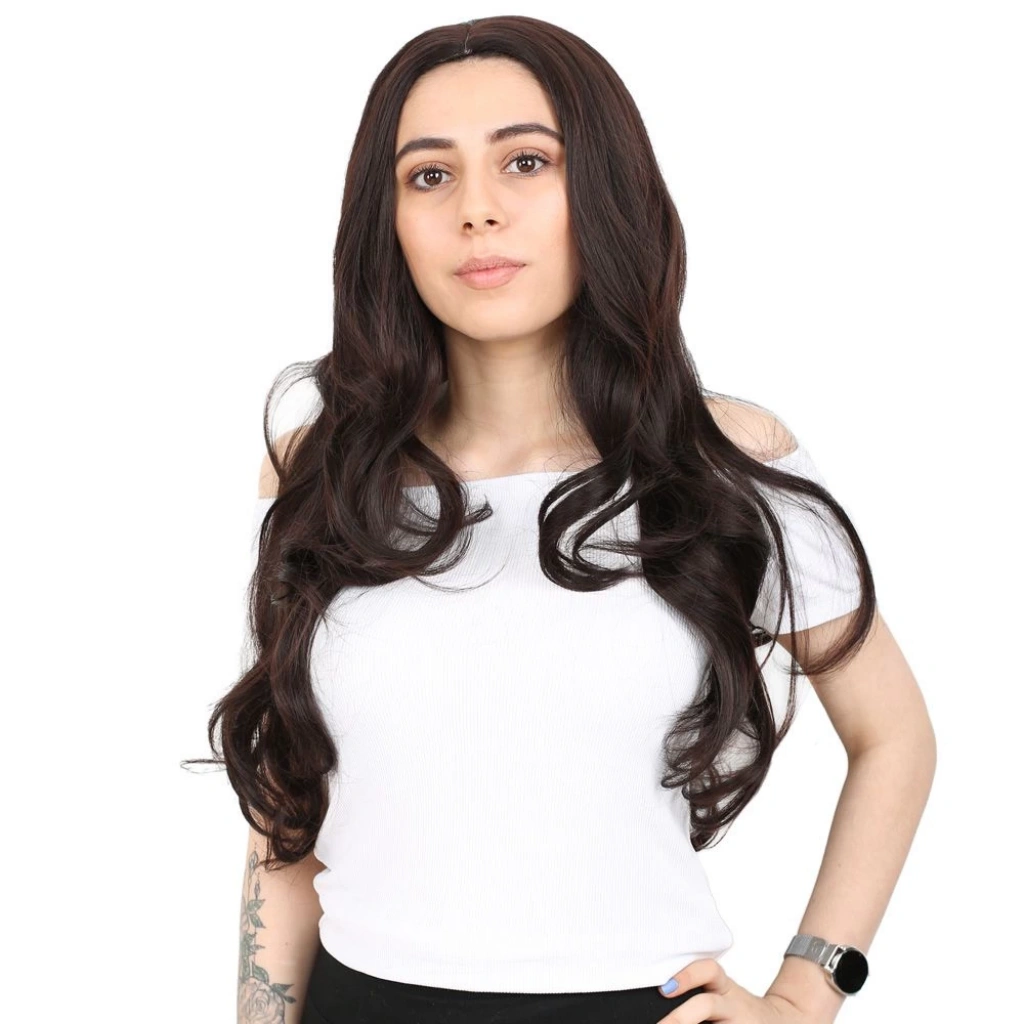 Dalgalı Perçemli Uzun Fiber Sentetik Peruk - Koyu Kestane