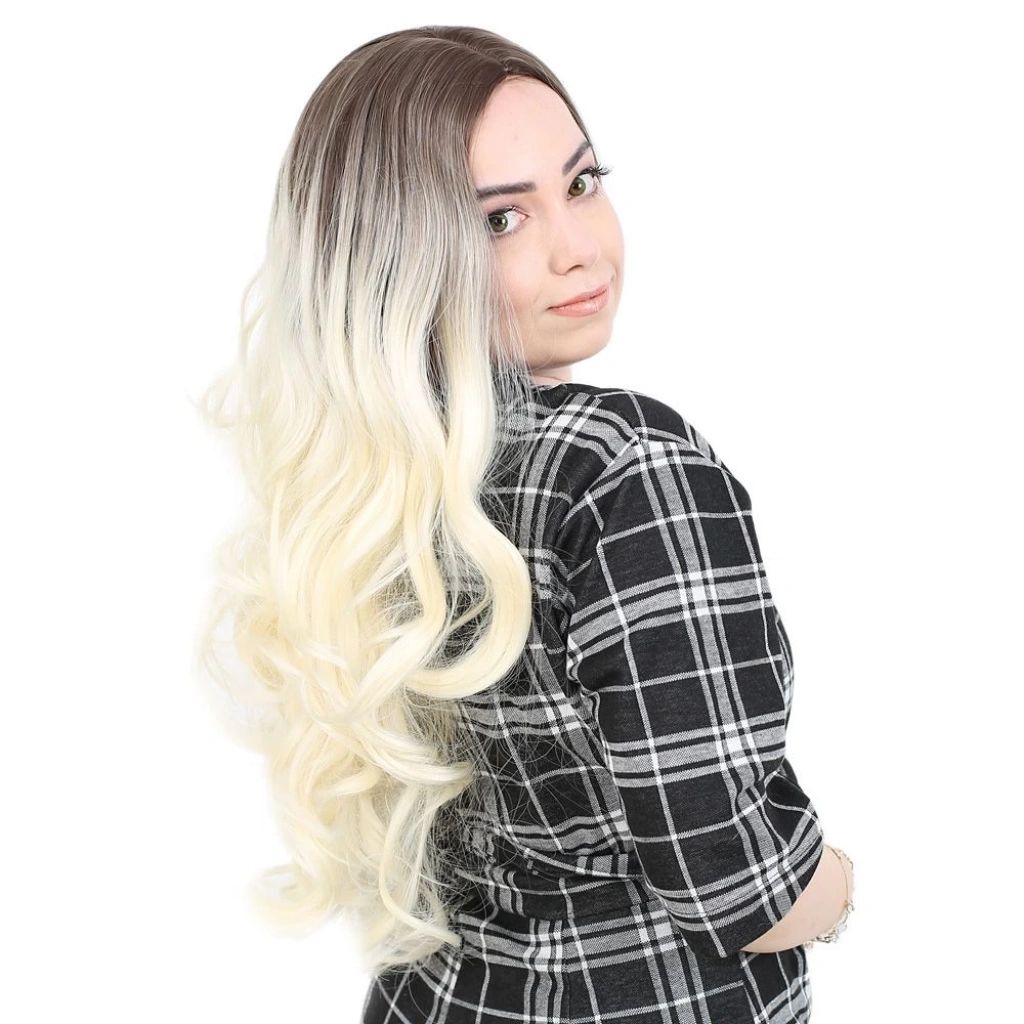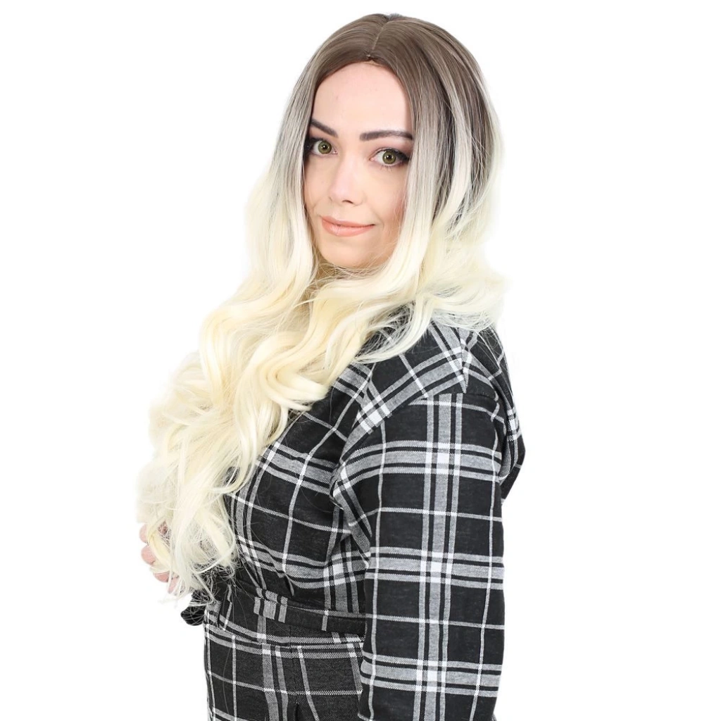Yoğun Dalgalı Fiber Sentetik Uzun Perçemsiz Peruk - Küllü Açık Kahve / Platin Ombreli