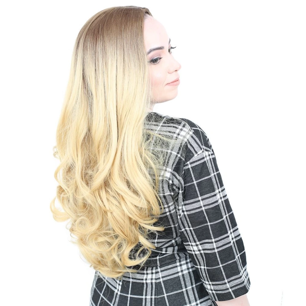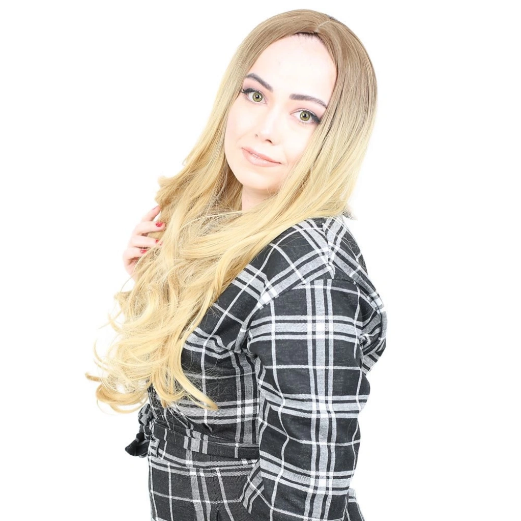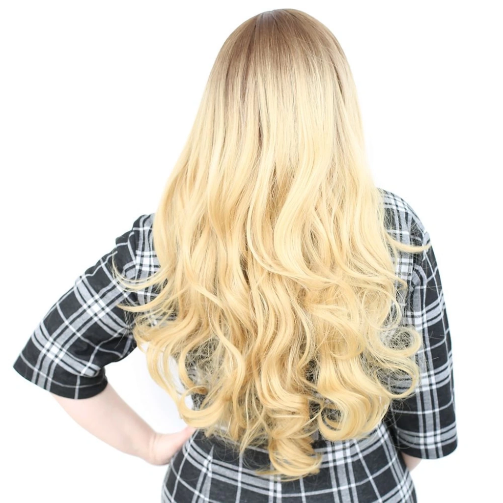 Yoğun Dalgalı Fiber Sentetik Uzun Perçemsiz Peruk - Kumral / Sarı Ombreli