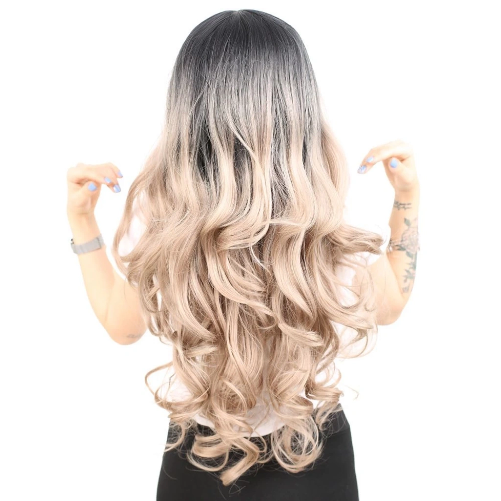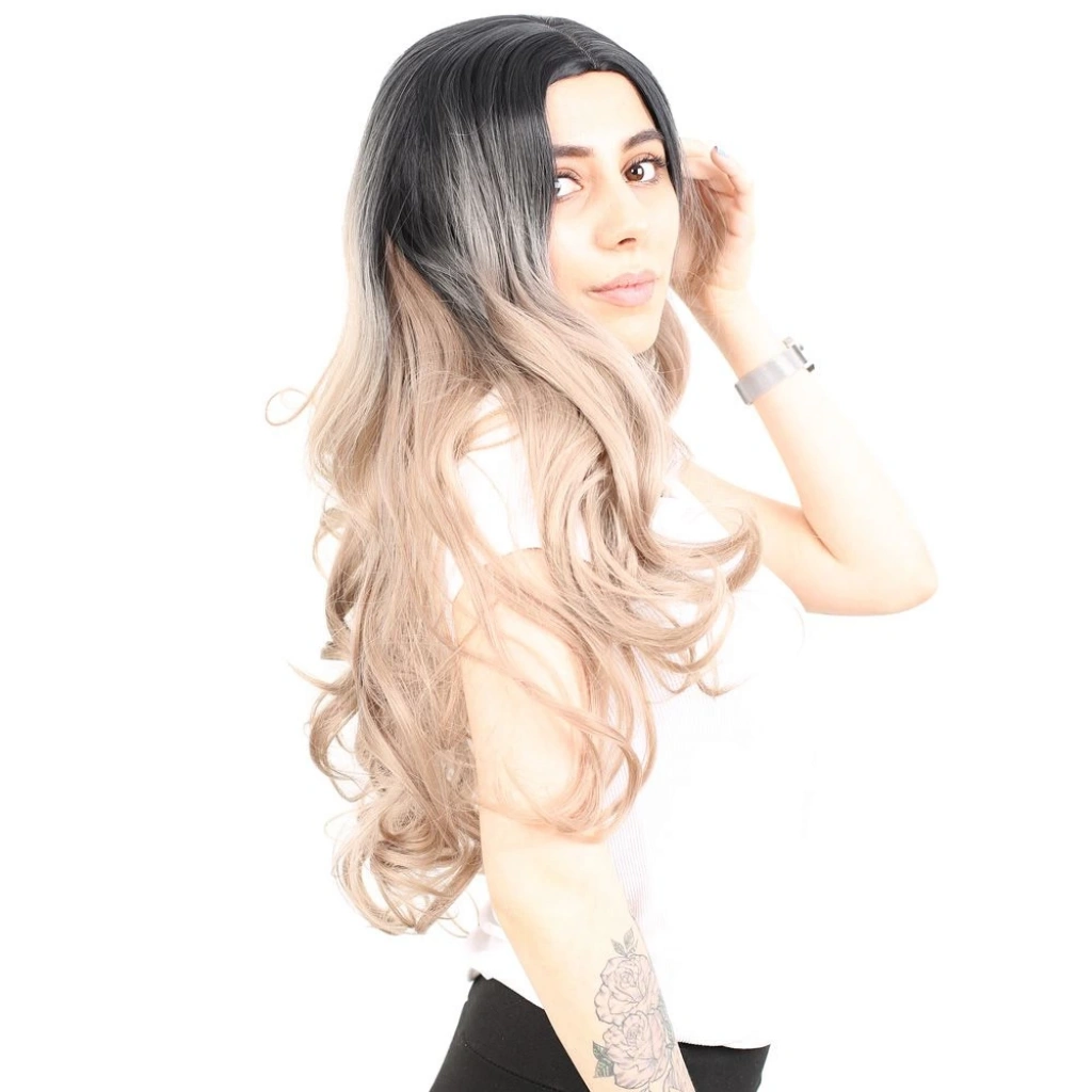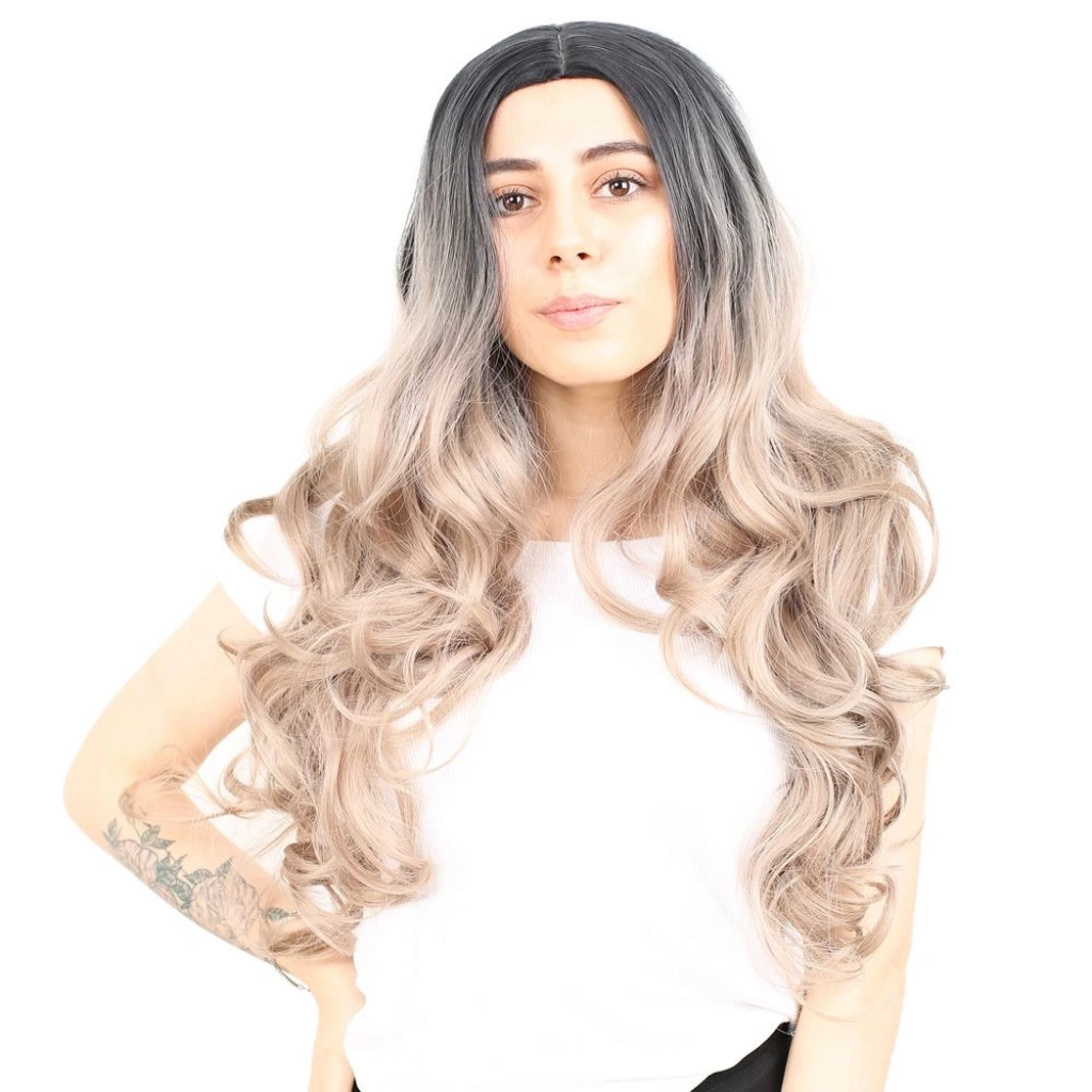 Yoğun Dalgalı Fiber Sentetik Uzun Perçemsiz Peruk - Siyah / Küllü Bebek Sarı Ombreli